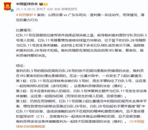 1月8日晚上,中国篮协官方发布通告,正式确认广东与山西一战中裁判存在四次重大误判。然而,篮协承认错了也白搭,漏判了山西队2次违体犯规,结果是不能更改的,广东队只能吃个哑巴亏了。