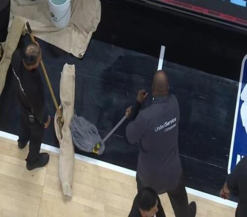 于是双方都觉得这球打不了,那就只能继续清理,结果又擦了一个小时地板,擦到了中午11点发现地板还是潮,上去之后还是容易摔。最后清洁工把工具收好直接撤离了,整整5个大拖把,3个大桶。放到CBA说实话都没有这种事,本来双方球员都已经进场热身了,最后又紧急返回更衣室了,CBA还真干不出这么业余的事来。