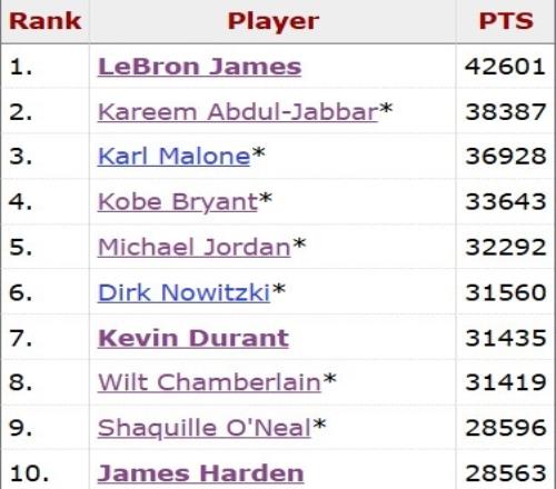 本场比赛过后,哈登再得15分就能够超越沙奎尔·奥尼尔,上升至NBA历史得分榜第九。