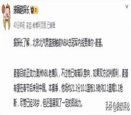 根据媒体人“赵探长”的报道,北京北汽男篮接触前NBA总冠军内线贾维尔-麦基。