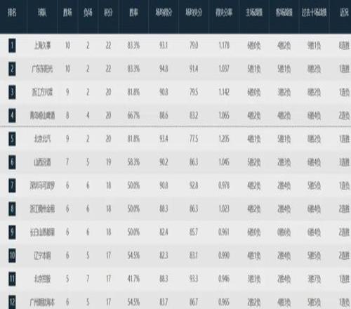 北京队目前以9胜2负排名联盟第五,场均得分93.4第三,失分77.5第一,篮板40.4第四,百回合得分128.6第一,百回合失分106.8第三,百回合净胜分21.8第一,有效命中率57.1%第一等等。
