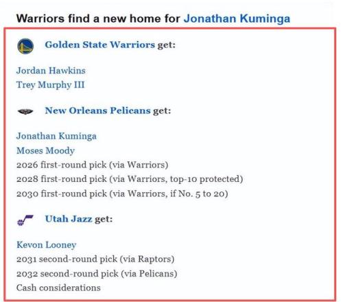 随着1月8日特雷-杨交易的尘埃落定,NBA交易截止日的氛围愈发浓烈,各支志在冲冠的球队纷纷加快了补强脚步。其中,金州勇士的动向始终牵动着球迷的心,ESPN最新披露的一笔三方交易方案更是引发了全网热议:勇士将送出库明加、穆迪以及2026年无保护首轮等三个首轮签,从鹈鹕得到墨菲和霍金斯,爵士则作为第三方接手卢尼并获得次轮签与现金补偿。对于身处争冠窗口期的勇士而言,这笔需要押上未来的交易究竟是明智之举,还是冒险豪赌?