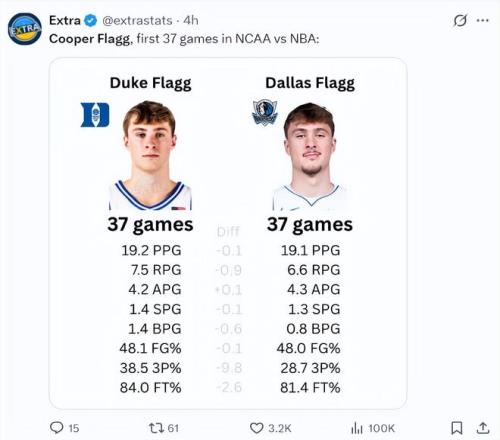 数据媒体晒出了弗拉格杜克大学前37场比赛与NBA前37场的数据对比,这个差距非常之效,NBA场均19.1分6.6篮板4.3助攻1.3抢断0.8盖帽,命中率48%,三分命中率28.7%。