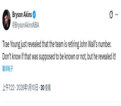 采访中,作为奇才的新面孔,特雷-杨还顺带爆了个料,他提到奇才计划退役沃尔的2号球衣。多位记者转发并感谢了特雷-杨的爆料。