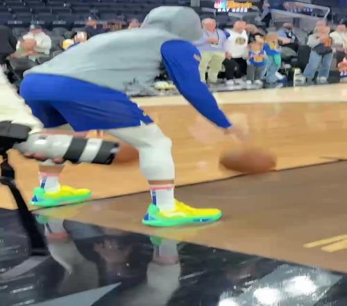 库里今天穿着巴特勒签名鞋JB3 Samba Dancer参加赛前训练