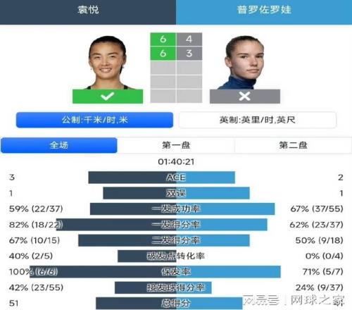 赛后技术统计,袁悦在发球稳定和关键分把握上表现非常不错,她全场发出了4记Ace球,没有出现双误,这与她在澳网比赛中二发得分率仅47%的表现形成鲜明对比。袁悦在破发点把握上效率惊人。她全场共获得五个破发机会,成功兑现四个,破发成功率高达80%。而普罗佐罗娃虽然获得了七个破发点,但只成功破发一次。
