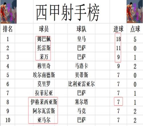 射手榜方面,姆巴佩18球高居榜首,托雷斯今天错失良机未能破门,还是11球排在第2。莱万最后打入一球,追上穆里奇,两人9球并列第3。莫里罗破门,伊格莱西亚斯双响,两人追上亚马尔,阿尔瓦雷斯等人,将前十门槛提高到7球。