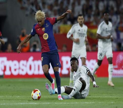 去年1月的西超杯,巴萨2-0战胜毕尔巴鄂竞技,皇马3-0轻取马洛卡,决赛连续3年上演国家德比对决。这场决赛打得极为精彩,亚马尔、莱万、拉菲尼亚(2球)的三叉戟破门,巴尔德打进1球,皇马则由姆巴佩、罗德里戈破门,巴萨5-2大胜。