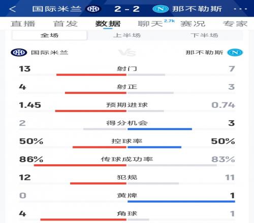 体育播报1月12日宣 在本轮意甲,国米2-2战平那不勒斯,以下为双方全场数据对比: