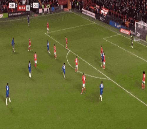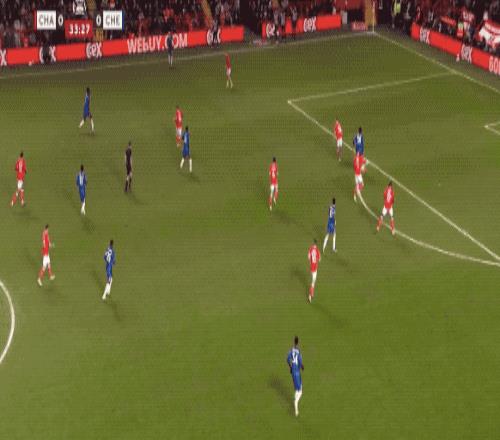 第34分钟,切尔西在前场连续一脚传球,阿昌庞的远射力量十足,门将奋力将球扑出。