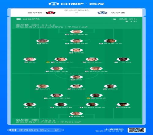 切尔西首发:12-约恩森、34-乔什·阿昌庞、4-阿达拉比奥尤、5-巴迪亚西勒、21-哈托、25-凯塞多、17-桑托斯、11-吉滕斯、40-博纳诺特、49-加纳乔、38-吉乌