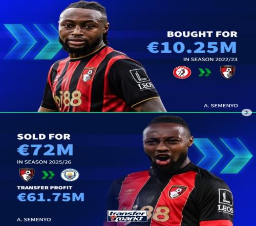 体育播报1月10日宣 曼城已经官宣签下塞梅尼奥,《转会市场》统计显示这也是伯恩茅斯近年来通过转卖盈利最多的一笔交易(单位:欧元)。