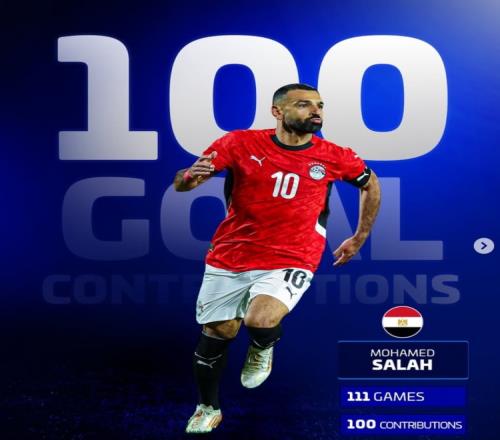 数据统计显示,萨拉赫达成埃及国家队直接参与100球里程碑,共计出战111场贡献65球35助攻。