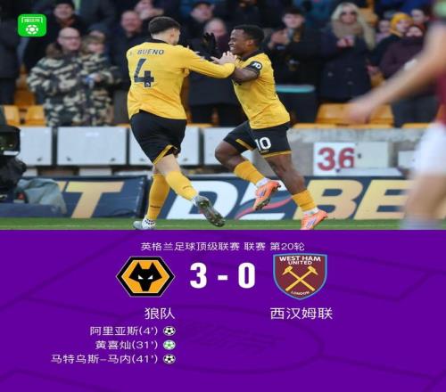 北京时间1月3日英超联赛第20轮,狼队主场对阵西汉姆联。狼队上半场便早早锁定胜局:先是阿里亚斯闪击破门,送出助攻的黄喜灿点射破门,小将马特乌斯-马内低射破门锁定胜局。下半场场上局势稍显沉寂,双方均未能改写比分。最终狼队主场3-0完胜西汉姆联,获得英超新赛季首胜。