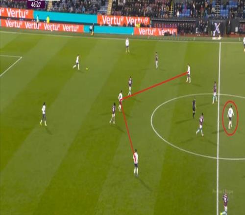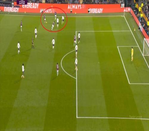 但曼联被打穿肋部是显而易见的事实,而且在局部,你可以看到曼联实际上陷入了二防三的情况,卡塞米罗无法同时防对手传球和跑位: