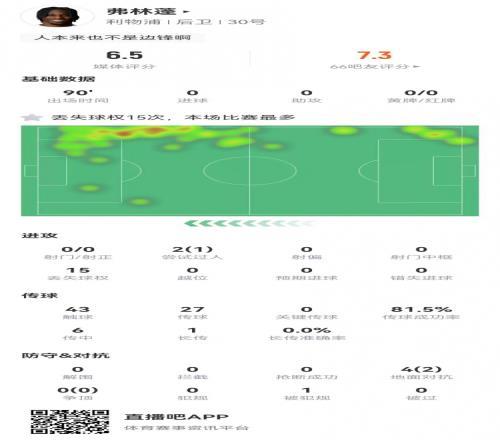 体育播报1月9日宣 利物浦在本轮英超对阵阿森纳,弗林蓬客串边锋数据如下:
