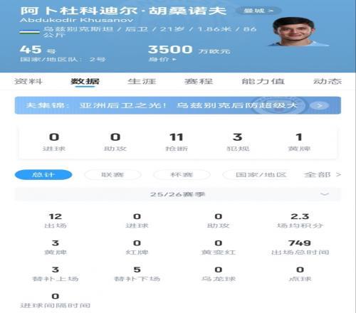 本赛季初胡桑诺夫一度也拿到了首发的位置,但之后他遭遇脚踝伤病,恢复后瓜帅又将他放上了替补席。不过由于目前鲁本·迪亚斯、格瓦迪奥尔和斯通斯的伤病,胡桑诺夫需要扛起曼城后防的大旗。