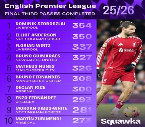 英超进攻三区成功传球榜:索博居首维尔茨、B费、赖斯、恩佐在列