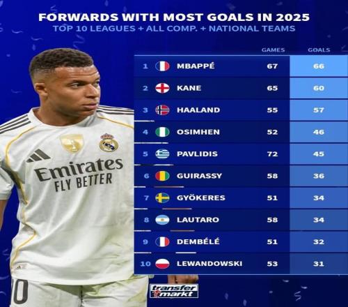 北京时间1月4日,德转列出了2025年欧洲前10联赛的前锋在国家队和俱乐部各项赛事中进球数TOP10,姆巴佩67场进66球第1,哈里-凯恩65场进60球第2,哈兰德55场进57球第3。