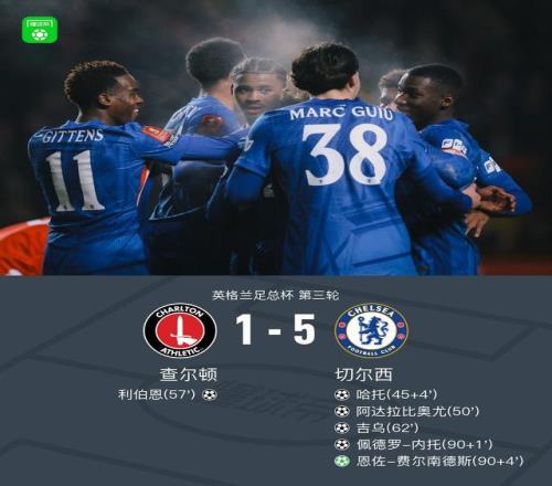 北京时间1月11日,英格兰足总杯第三轮展开较量,查尔顿迎战切尔西。上半场吉滕斯屡次远射造险,哈托爆射破门,下半场阿达拉比奥尤头球建功,利伯恩扳回一球,吉乌补射得分,内托内切低射破门,恩佐点射锁定胜局。全场结束,查尔顿1-5不敌切尔西。