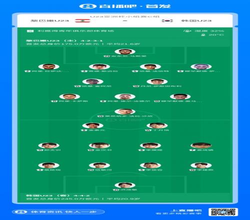 体育播报01月10日宣 北京时间19:30,U23亚洲杯小组赛C组第二轮,黎巴嫩U23vs韩国U23,赛前官方公布首发阵容。